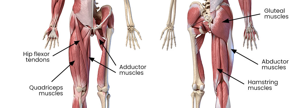 A groin strain refers to pain that comes from one of the 5 adductor muscles on the inside of your thigh. These muscles work to move your leg towards the midline of your body and help stabilise your hip during activity.